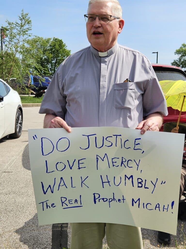 Retired Methodist minister Philip Amerson attended the protest rally held before Indiana Lt. Gov. Micah Beckwith’s Ellettsville town hall. Amerson said Beckwith “distorts the message of Jesus.” (Photo/Marilyn Odendahl)