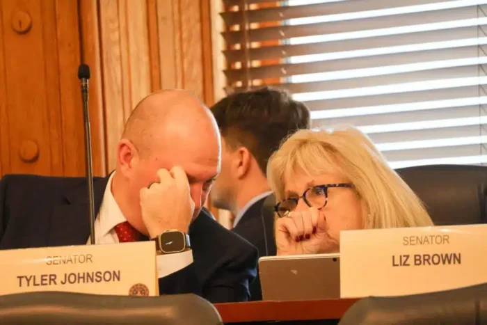 Sens. Tyler Johnson, R-Leo, and Liz Brown, R-Fort Wayne, talk to each other during the testimony on Senate Bill 51. (Photo/Abigale Lash of TheStatehouseFile.com)