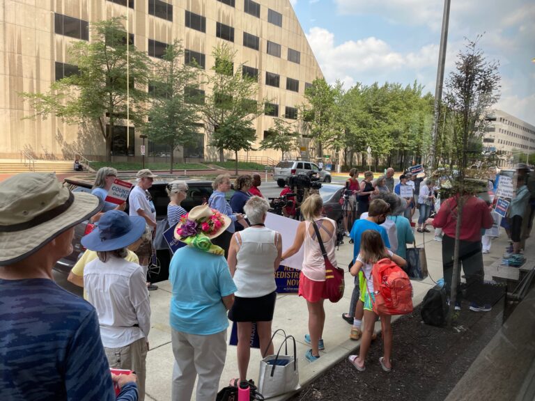 The lunch-hour rally, organized by groups including Common Cause of Indiana, Citizens Action Coalition, Women4Change Indiana, Hoosier Environmental Council and the Indiana Muslim Advocacy Network, began at Young’s Indianapolis office near Illinois and Ohio streets and continued with a march to Braun’s Indianapolis office about three blocks away.