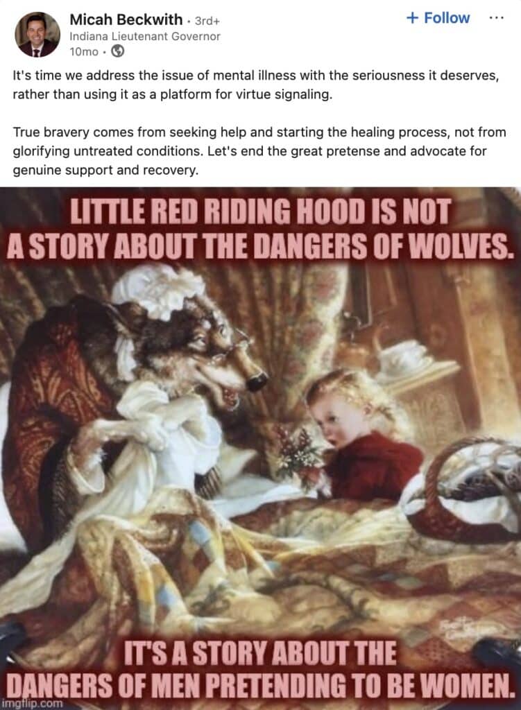 In a separate post on the platform LinkedIn from nearly a year ago, Beckwith posted a graphic linking a children’s story to matters of gender identity.