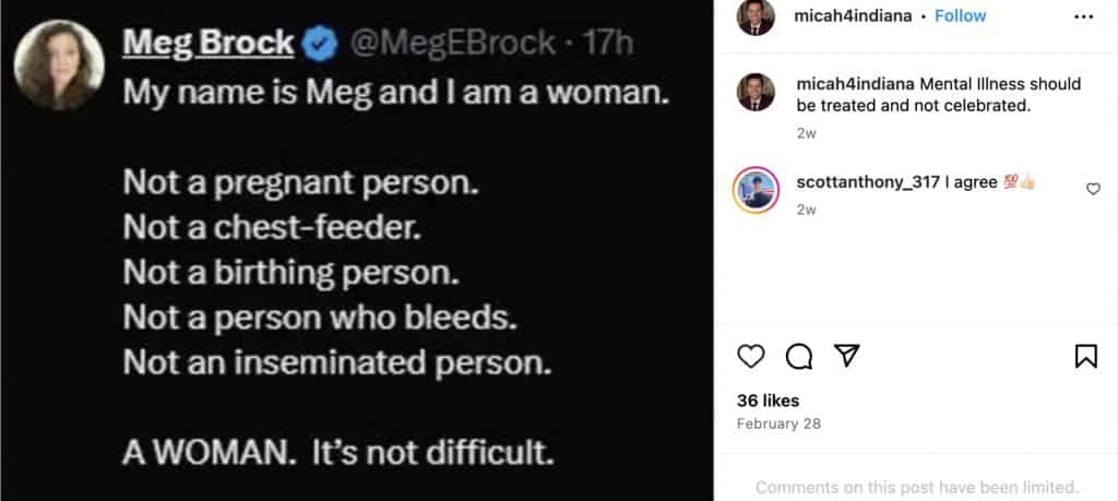 In February, Beckwith posted on the social platform Instagram a screenshot of a post originally on X from Meg Brock, a contributor to the conservative news outlet The Daily Caller, where she wrote, “My name is Meg and I am a woman” and continued with a list of labels that she does not identify with.
