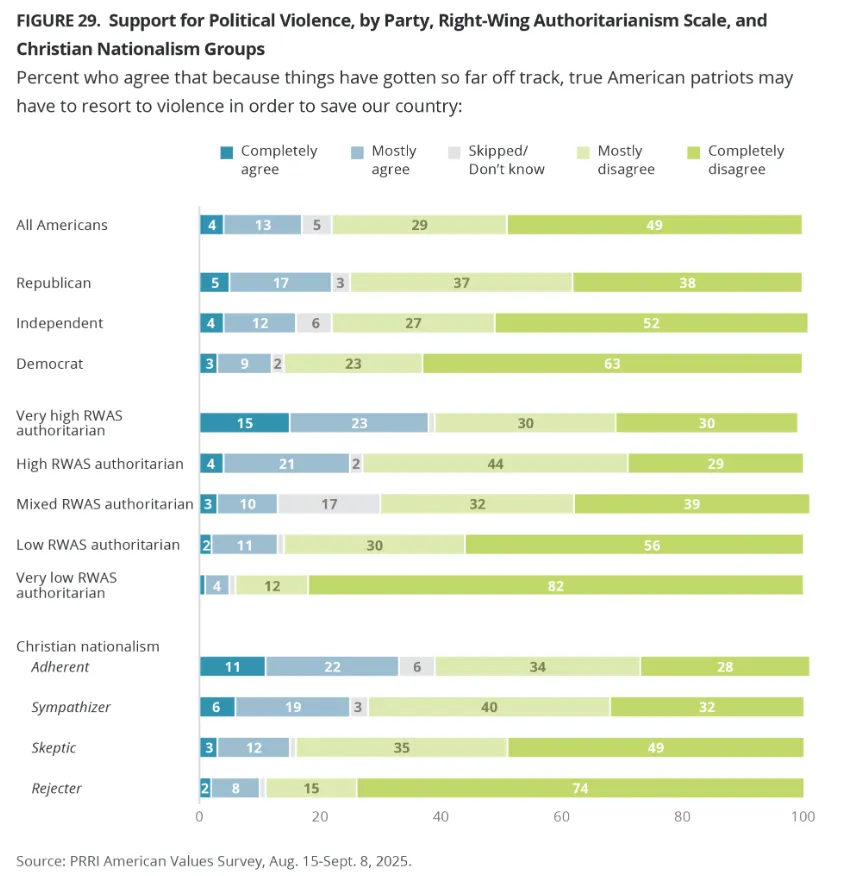 One of the most alarming findings of the past few PRRI surveys has been a growing, but still minority, level of support for political violence. In the current survey they actually find the level of support for political violence has declined from its high in 2023, where just over 23% said true patriots may have to resort to violence to put our country back on track.