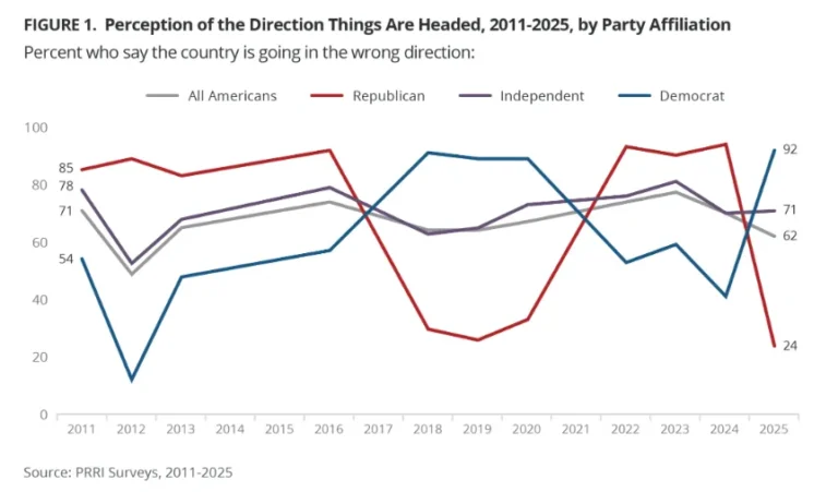 This, of course, has to do with which party sits in the Oval Office, as the figure below clearly demonstrates. In 2024, when Biden was president, 94% of Republicans said the country was going in the wrong direction. Today, only 24% of Republicans say the same.