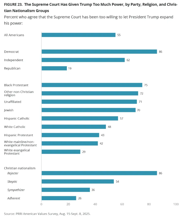 Looking at the Supreme Court specifically, we see a slim majority of Americans agree SCOTUS has been too willing to let Trump expand his power. And yet again, Hispanic Protestants and white Christians (evangelical, Catholic, mainline) are mostly aligned in that they do not believe SCOTUS has given Trump too much power.