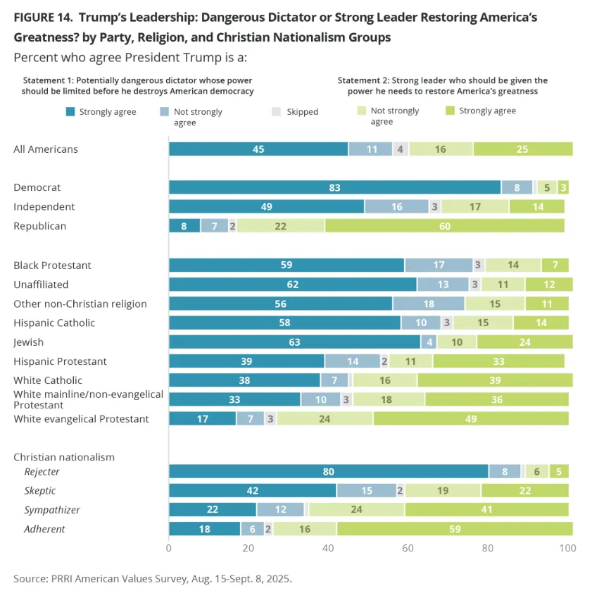 While the data visualization is just a bit confusing, PRRI asked folks to agree or strongly agree with one of two statementsāIs Trump a dangerous dictator or a strong leader? Most Americans see him as a potentially dangerous dictator.