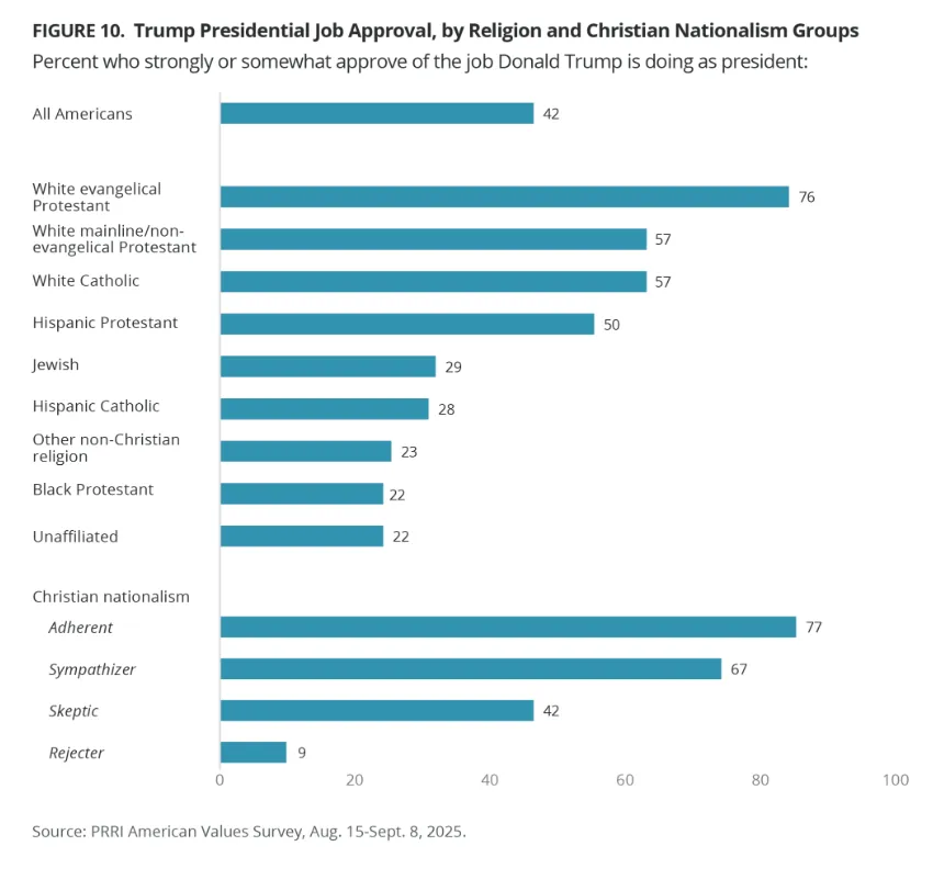White Christian groups have the highest levels of approval of Trumpās second term as president. White evangelicals (76%) are clearly thrilled, with slim majorities of white mainline and white Catholics approving of Trump.