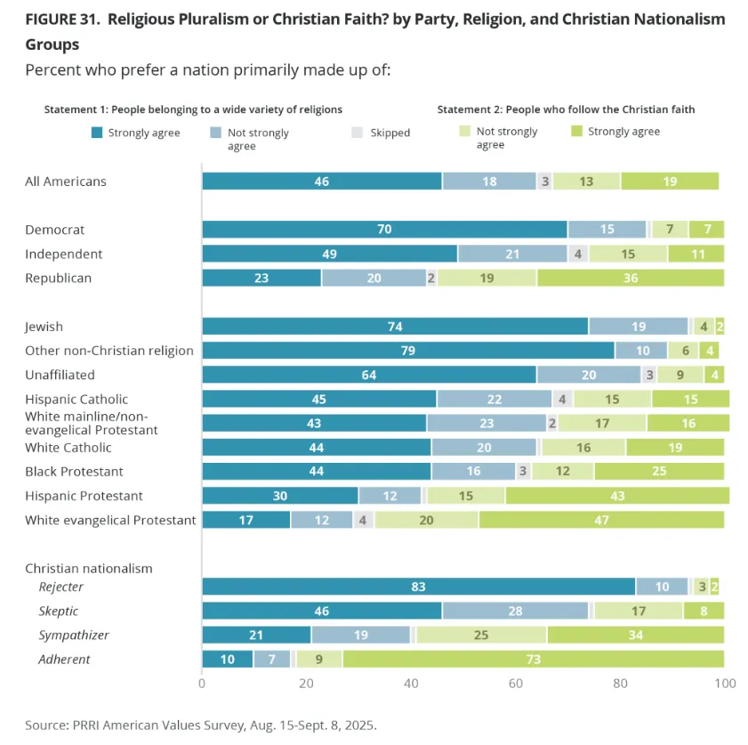 White evangelicals and Hispanic Protestants are the only religious groups where a majority say theyād rather have a country where most people follow the Christian faith. The fact that Hispanic Protestants score so high here is evidence that embracing this religious identity is linked to demonstrating their āAmerican-ness.ā My guess is that quite a few Hispanic Protestants are Adherents of Christian nationalism, and as we can see at the bottom of the figure, a vast majority of those folks want a nation full of Christians. So while their race/ethnicity might be seen as a mark against their āAmerican-ness,ā Hispanic Protestants embrace Christian nationalism in order to show they are truly American.