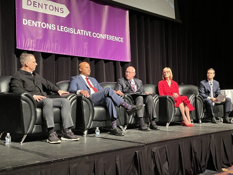 The Republican gubernatorial candidates who spoke during the Dentons Legislative Conference Wednesday in Indianapolis were (from left)Â Eric Doden, Curtis Hill, moderator Tobin McClamroch, Lt. Gov. Suzanne Crouch and Brad Chambers. Sen. Mike Braun appeared in a video message. (Photo/Dentons)