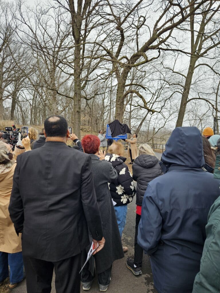 The plaque, blue with yellow lettering, is perched beside a peaceful respite area where visitors can relax and watch the water ripple and run between the riverbanks. When the ceremony ended, many braved the brutal weather a little longer to get a closer look at the marker and take a photograph.