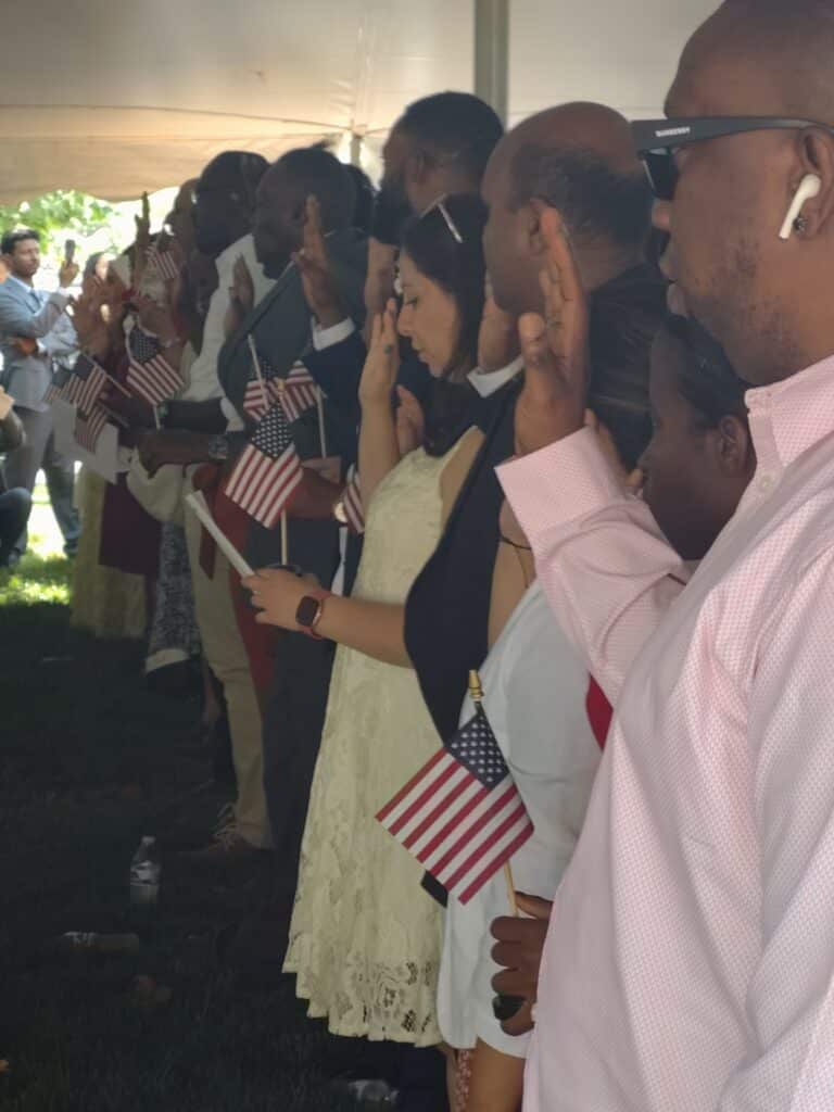Akinnola Johnson Omoniyi, who emigrated from Nigeria and became a U.S. citizen in 2018, stood under a shade tree and watched the ceremony while his three sons romped close by. He was there to support his friend, Ibrahim Mujadu, who was becoming a naturalized citizen.