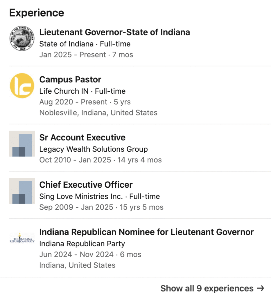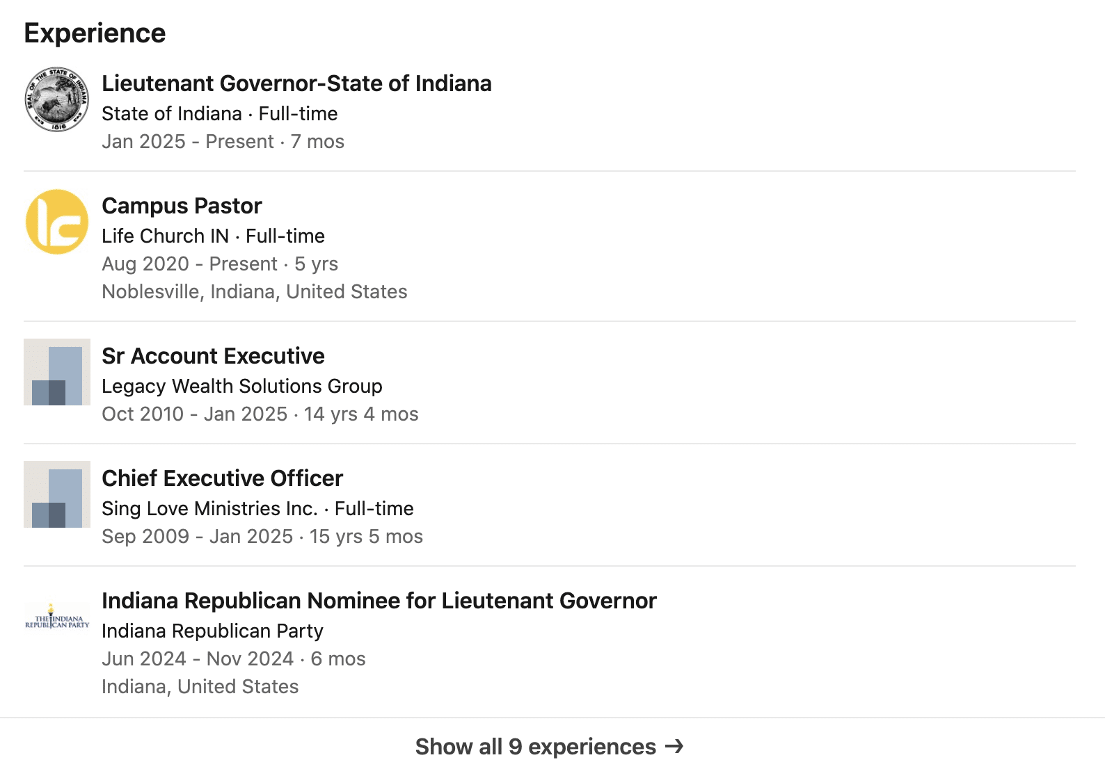 Beckwith, who identifies himself as a Christian nationalist, was sworn in as Indiana’s lieutenant governor in January. He is also listed on Life Church’s website as its Noblesville campus pastor, a role he has held since 2020. He includes both positions on his personal LinkedIn profile as full-time.