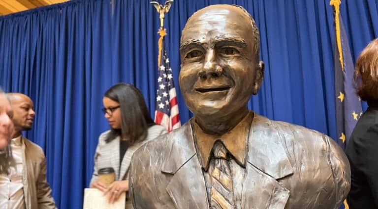 Above: A bust of former Indiana Gov. Joe Kernan unveiled at the Statehouse on Friday, March 17, 2023. (Casey Smith/Indiana Capital Chronicle)