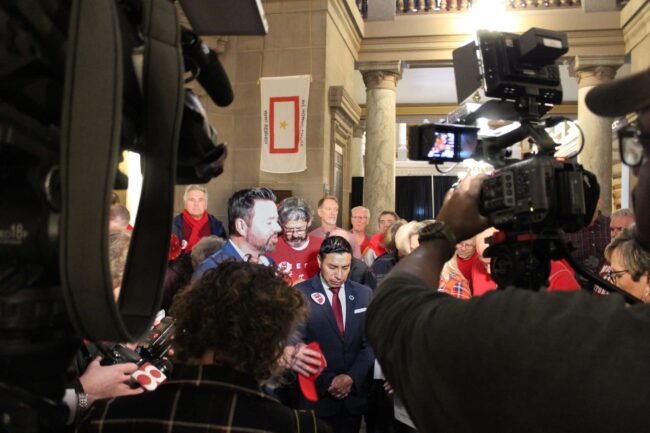 Lt. Gov. Micah Beckwith, lead the crowd in prayer at the end of the redistricting rally Tuesday in the atrium of the Statehouse. Photo/Sydney Byerly