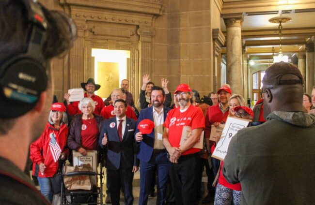 Lt. Gov. Micah Beckwith, left in red hat, and Secretary of State Diego Morales, in red tie, lead a rally Tuesday at the Statehouse in favor of mid-decade redistricting. Photo/Sydney Byerly