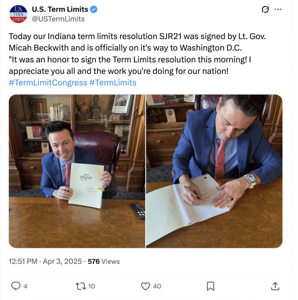 In an April 3 post to USTL’s X account, the lieutenant governor is seen smiling as he signs the resolution and sends it to the Capitol. The caption reads, “Today our Indiana term limits resolution SJR21 was signed by Lt. Gov. Micah Beckwith and is officially on its way to Washington D.C. ‘It was an honor to sign the Term Limits resolution this morning! I appreciate you all and the work you’re doing for our nation!’”