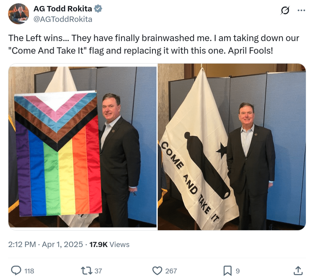 On April 1, Rokita used the flag to seemingly taunt his detractors on social media. He posted on X two pictures of himself, one standing beside a Pride flag and saying he was brainwashed into displaying that flag. In the other photo, he is smiling beside the “Come and Take It” flag and exclaiming “April Fools!”
