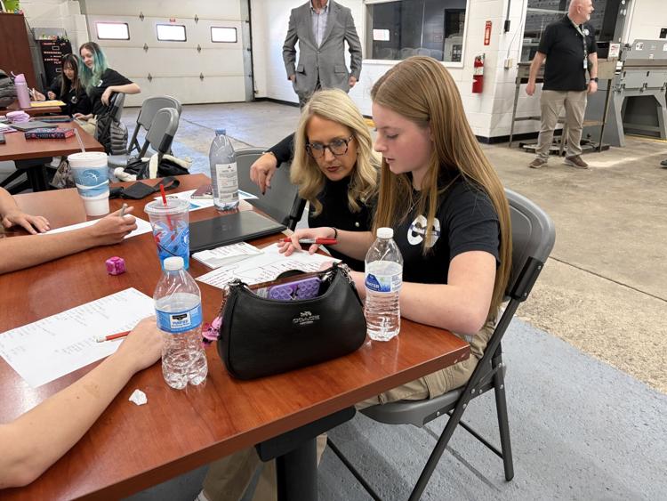 Jenner, a long-time educator, chatted with those students in typical teacher fashion. During the tour’s final stop, she crouched down at a desk next to criminal justice student Avery Richey and watched while Richey and her table worked on a dispatch activity.
