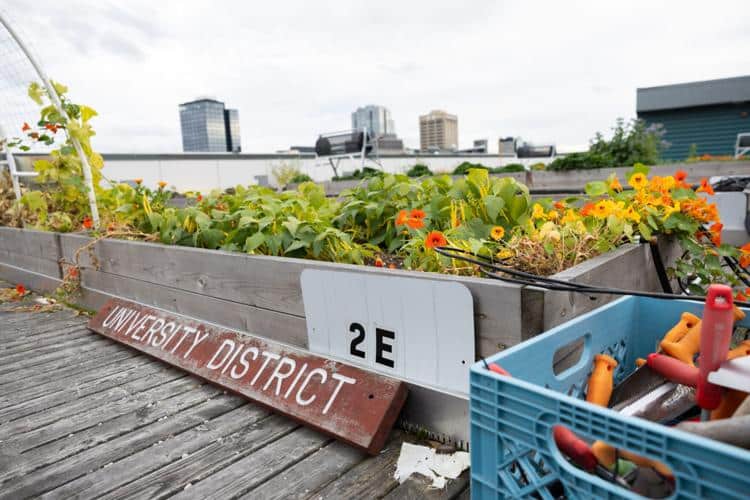 An elevator ride above the grocery, cafe and food storage spaces are dozens of beds of dirt. From donor money, the University District Food Bank opened its rooftop garden almost a decade ago. This year, volunteers and interns grew onions, tomatoes, peppers, cucumbers, nasturtiums and garlic and greens like spinach, chard, tatsoi, kale and romaine lettuce. Last year, they harvested 50 pounds of honey.